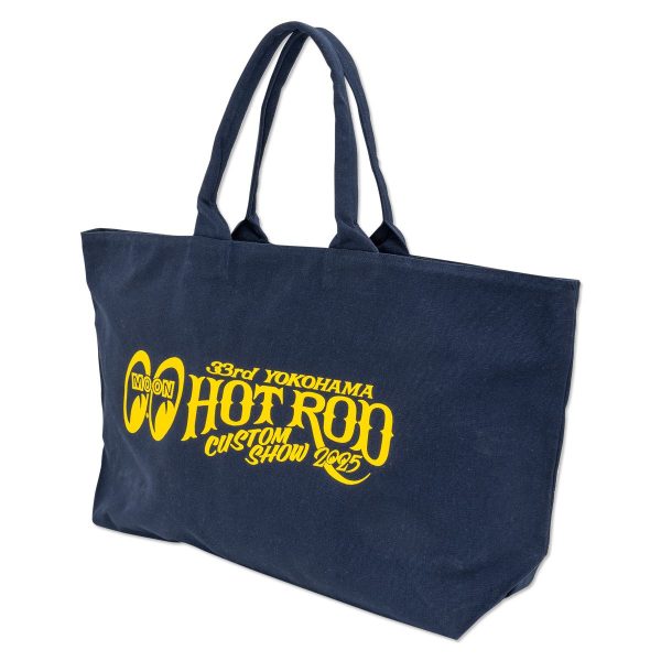 A wide, roomy tote bag with a zipper, featuring the MOON Eyeshape logo and HCS2025 logo designed by Wildman Ishii.
